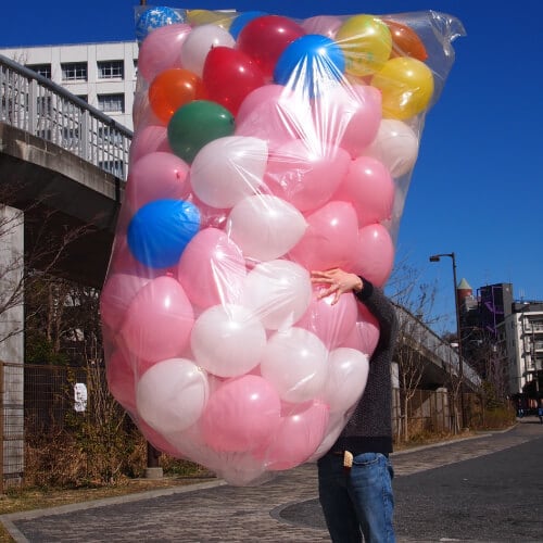 膨らませた10インチのゴム風船が100個も入るビッグサイズの透明袋です。